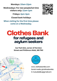 The clothes bank is in  the lobby of the  Car Park Exit, Kensington Town Hall, W8. You can access the pedestrian walkway into the lobby at the junction of Hornton Street and Phillimore Walk.
